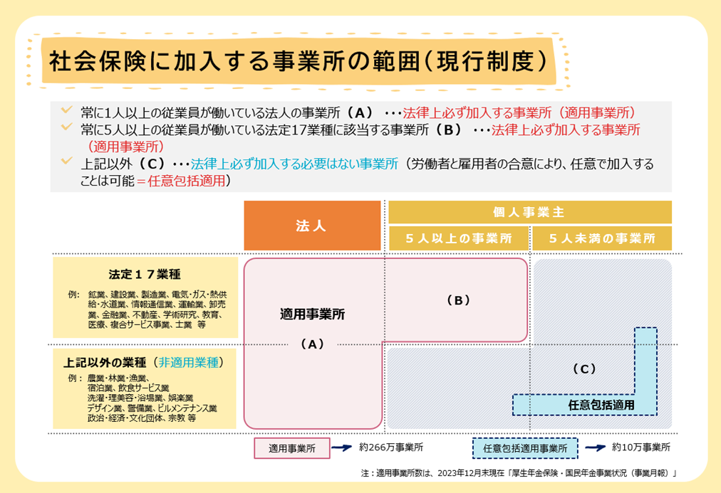 ※個人の事業所でも、従業員さんが5人以上で強制加入となります。