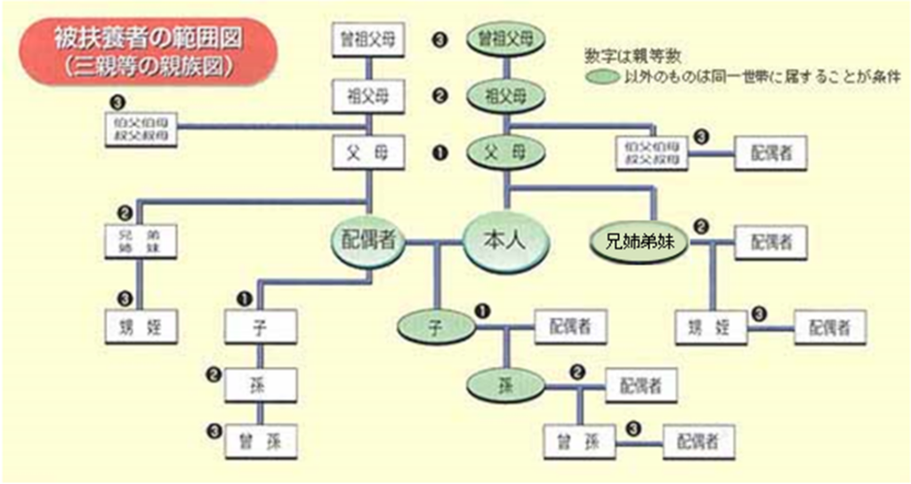 - 被保険者の直系尊属、配偶者(事実上婚姻関係と同様の人を含む)、子、孫、兄弟姉妹で、主として被保険者に生計を維持されているいる人※これらの方は、必ずしも同居している必要はありません。